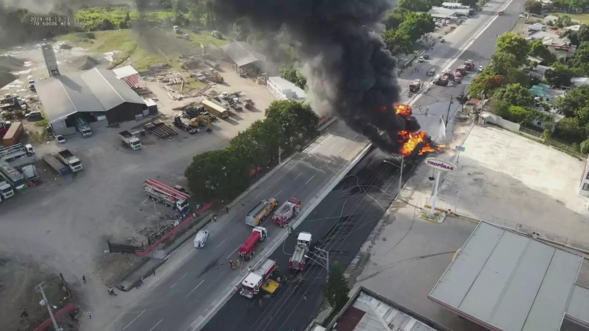 La Vega.– Después de más de cinco horas de arduo trabajo, los bomberos lograron extinguir el incendio que se desató tras la explosión de un camión de combustible en la Autopista Duarte, a la altura del sector El Llano en La Vega. El siniestro, que se originó luego de un accidente de tránsito, afectó a varias estructuras y destruyó tres vehículos.