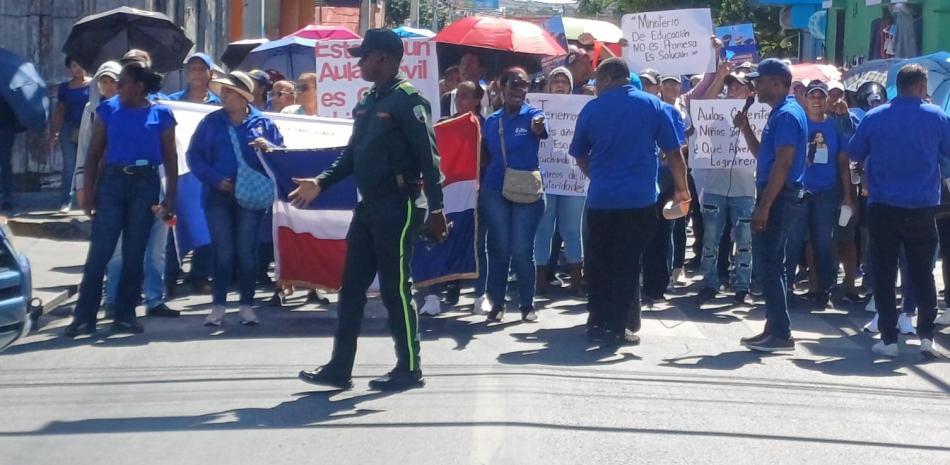 La marcha de los maestros fue custodiada por agentes de la Digesset y miembros de la Policía Nacional, que estuvieron también apostadas tanto a la entrada del edificio de la gobernación local como en las oficinas del Distrito Educativo.