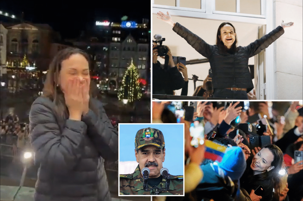 La multitud coreó “¡Libertad!” mientras Machado salía al balcón del hotel en Oslo, Noruega, y saludaba a sus partidarios antes de unirse a ellos para cantar el himno nacional de Venezuela.