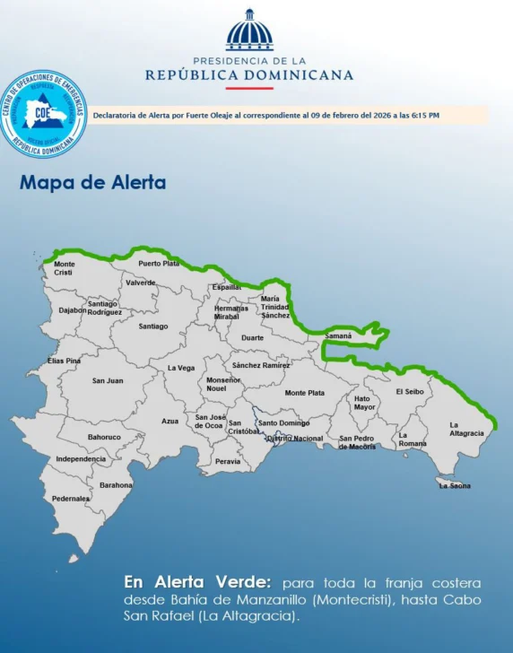 Santo Domingo, R.D. – El Centro de Operaciones de Emergencias (COE) emitió este martes nivel de alerta verde ante la posibilidad de inundaciones costeras menores, con mayor riesgo durante los períodos de marea alta, en toda la franja costera comprendida desde Bahía de Manzanillo, en Montecristi, hasta Cabo San Rafael, en La Altagracia.